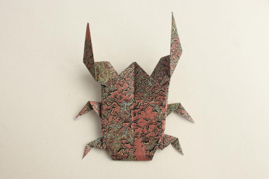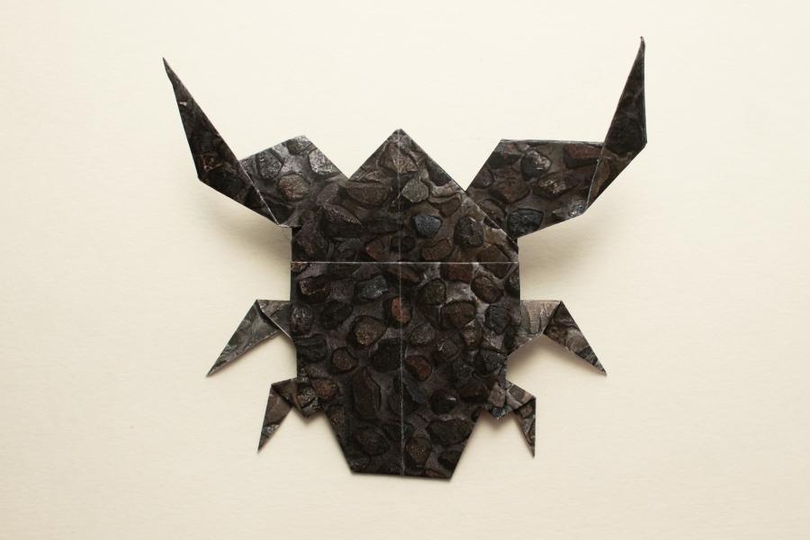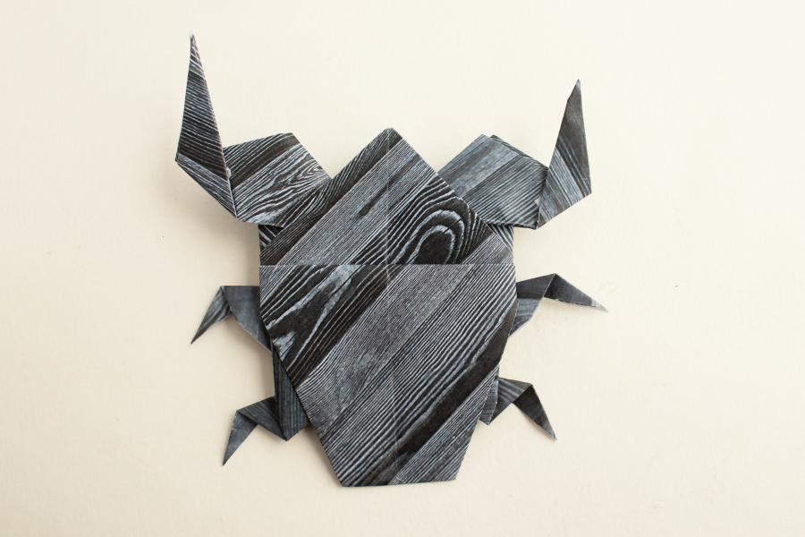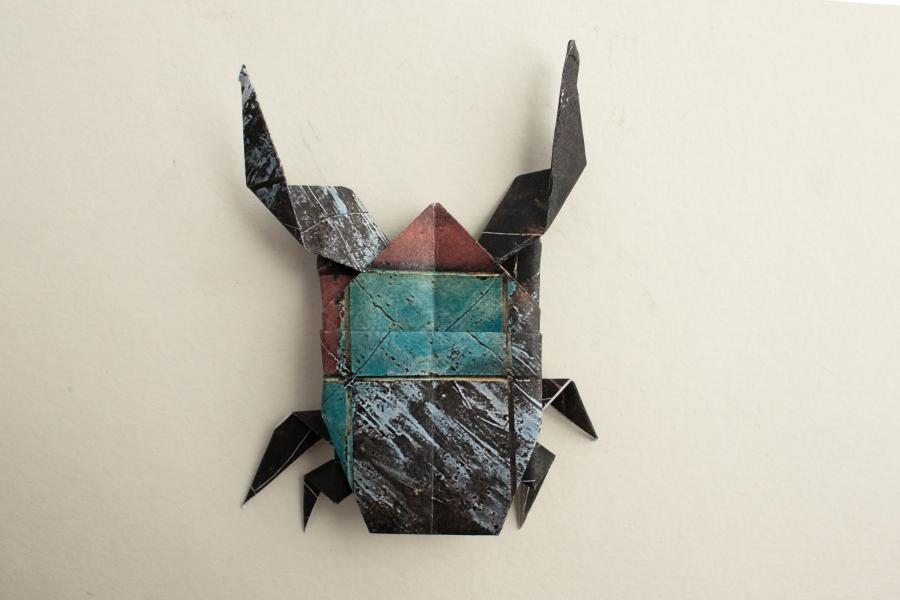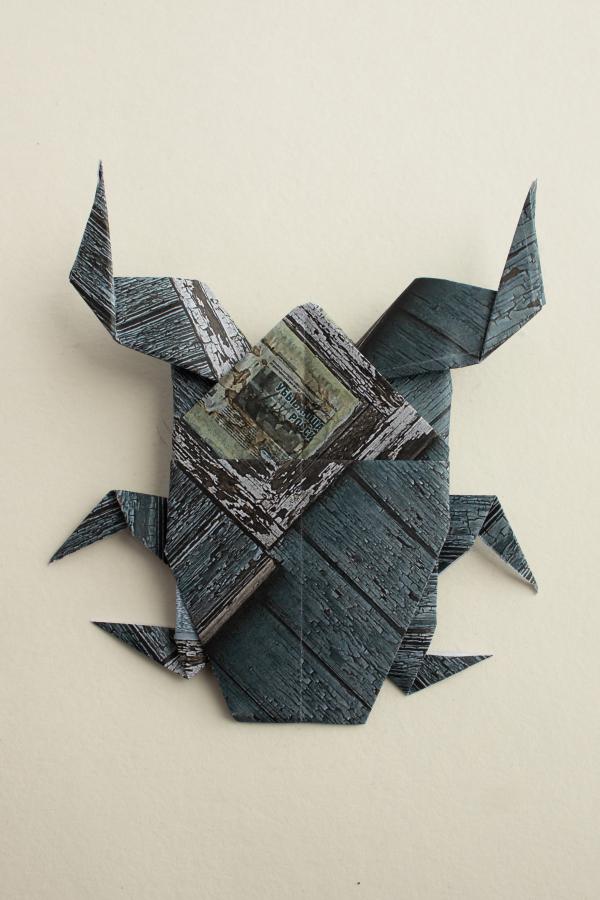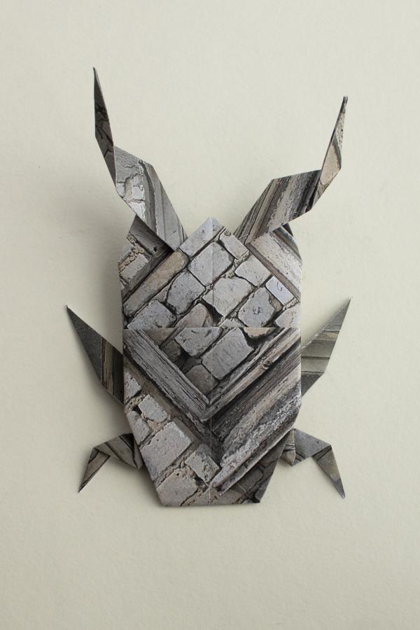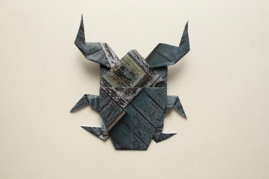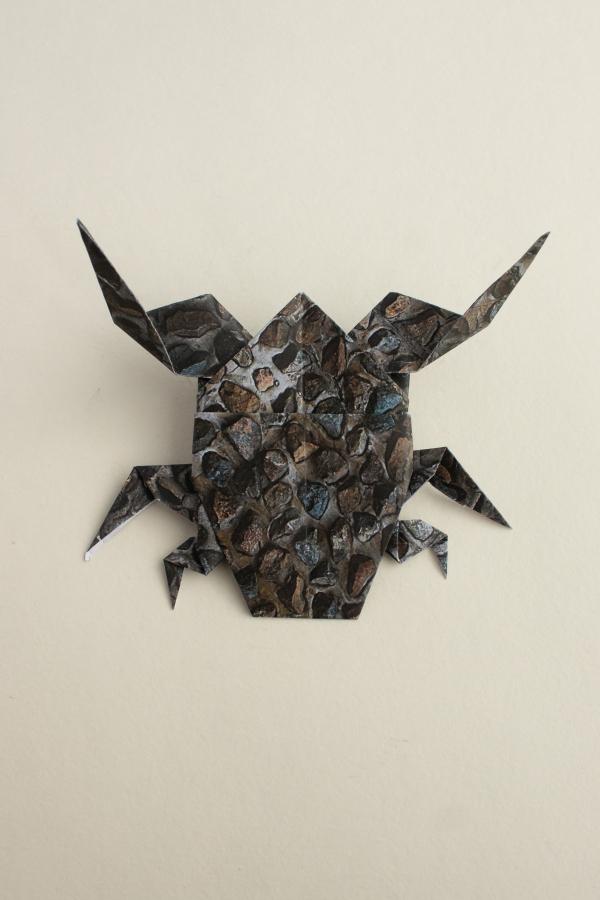Я сделала оригами в форме жуков. На бумаге – текстуры материалов, которые ассоциируются с природным хитином (от др.-греч. χιτών: хитон — кожа, оболочка).