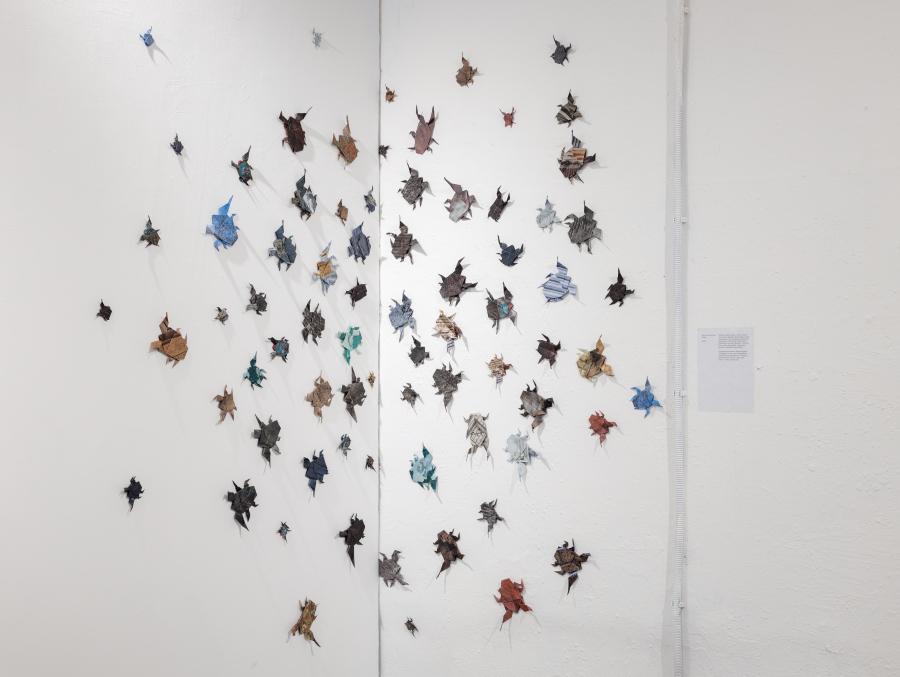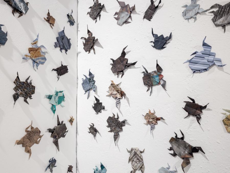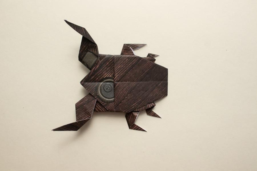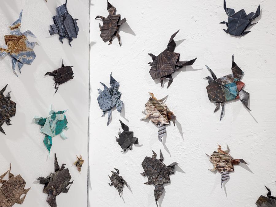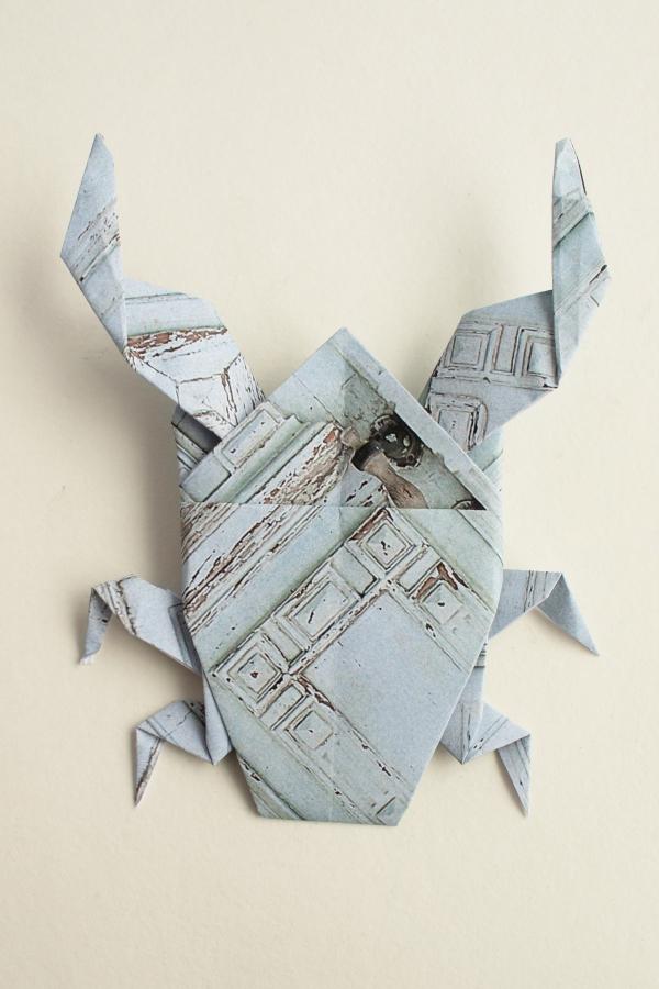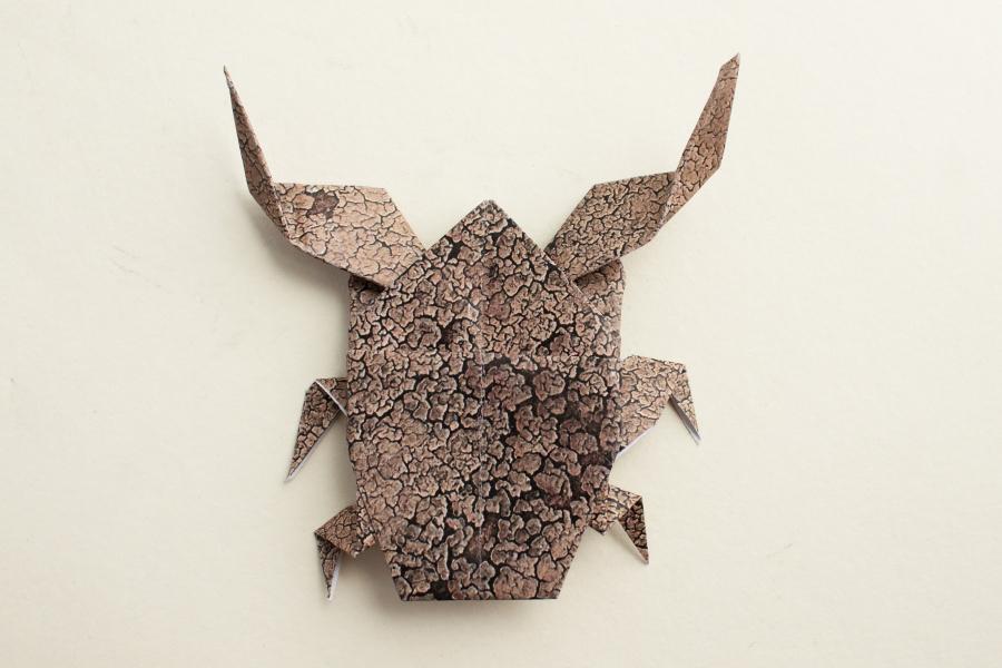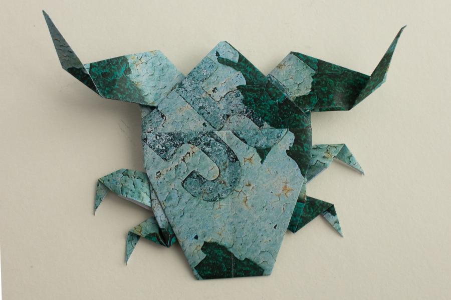 Я сделала оригами в форме жуков. На бумаге – текстуры материалов, которые ассоциируются с природным хитином (от др.-греч. χιτών: хитон — кожа, оболочка).